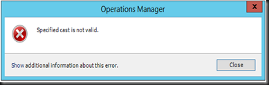In order to resolve this, i had deleted the specific entry from the OperationsManager database based on the solution found in http://www.ssistalk.com/2014/03/03/scom-2012-r2-specified-cast-is-not-valid-error/